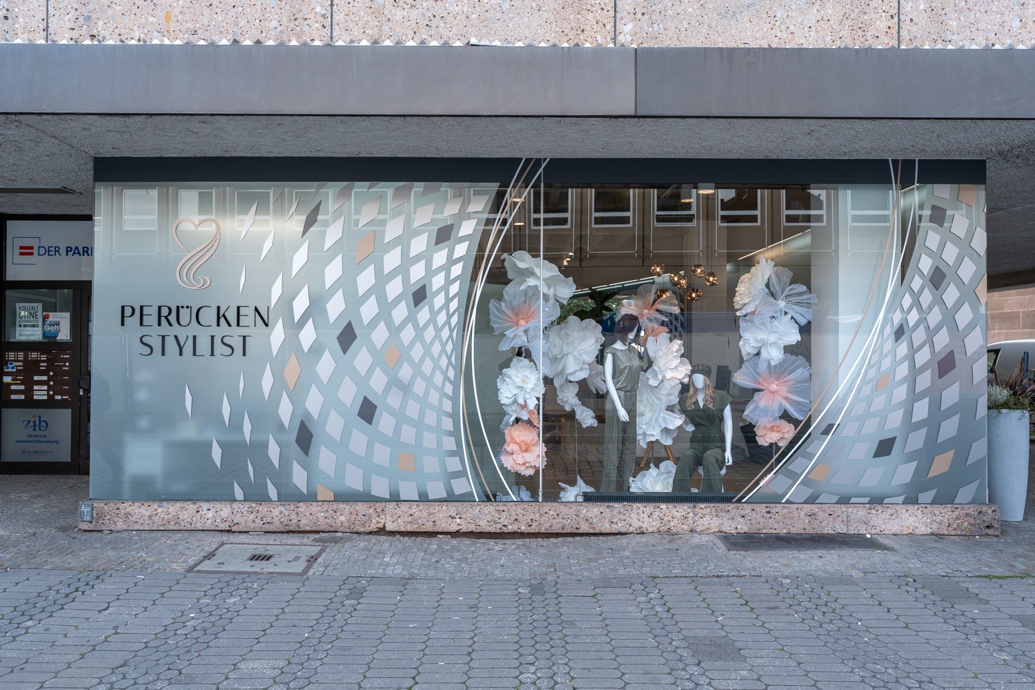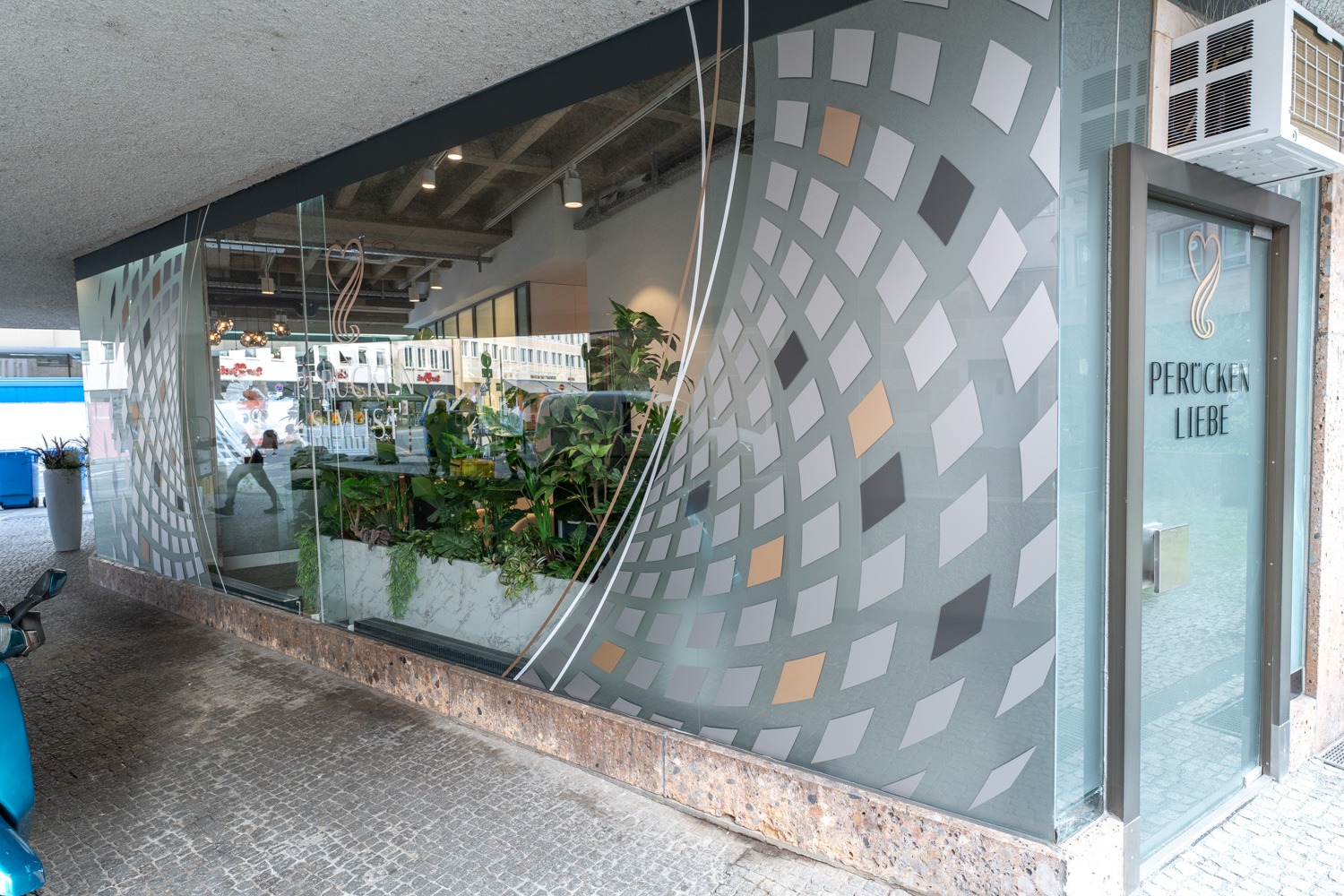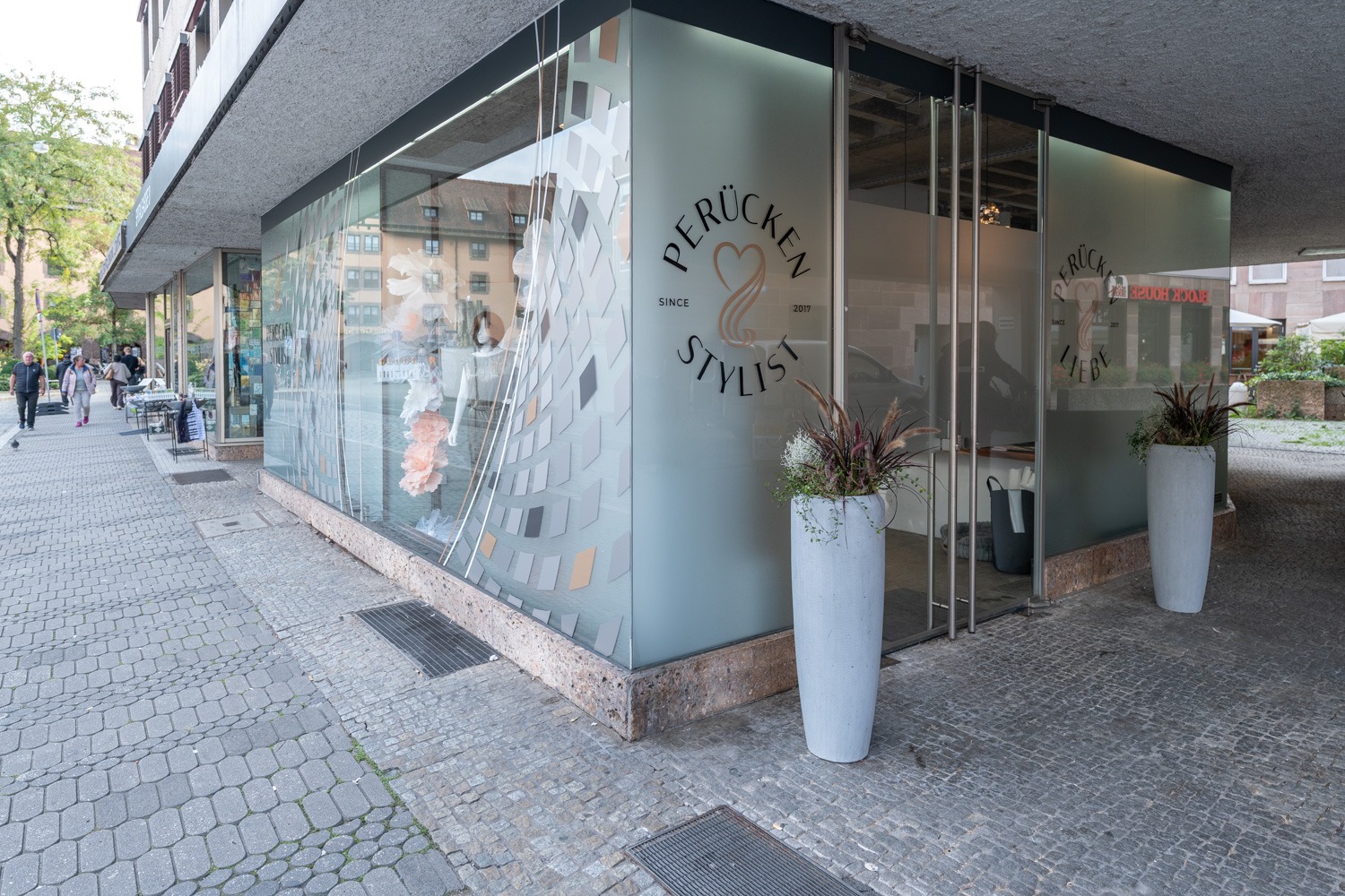Schaufensterbeschriftung für Perückenliebe in Nürnberg. Die Beschriftung besteht aus einem eleganten Folienplot, der in Silber, Messing und Milchglasfolie gestaltet ist. Dadurch entsteht ein modernes und ansprechendes Design, das die Aufmerksamkeit der Passanten auf sich zieht und das Geschäft stilvoll präsentiert.